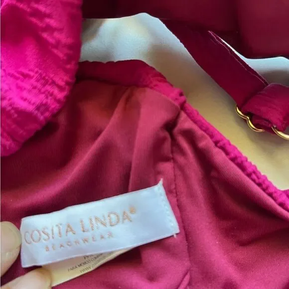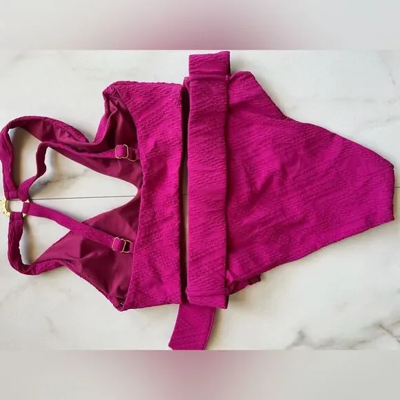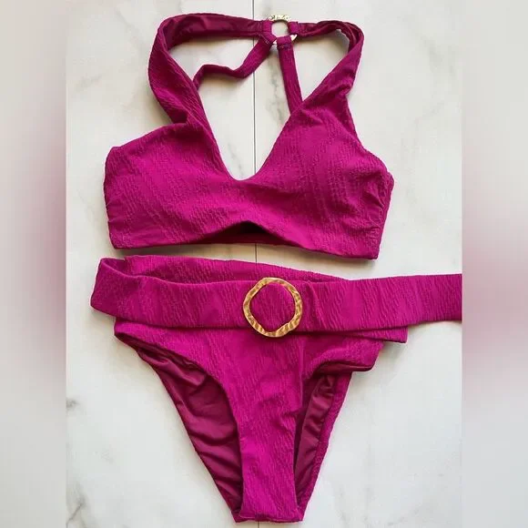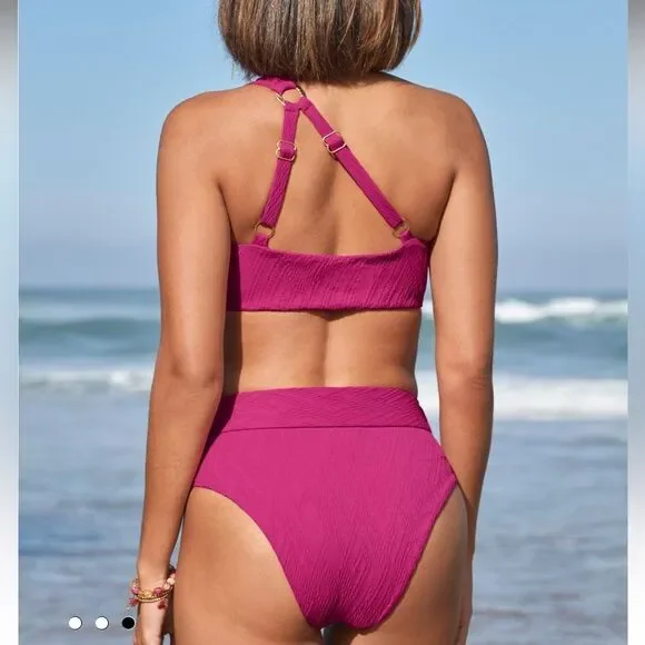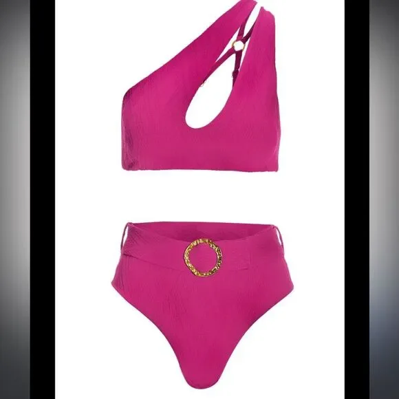 NWOT- Luxuriously soft and sexy two-piece bikini is designed with a distinctive one-shoulder cutout top and high-waist belted bottom, both accentuated with hammered O-ring details.Content & CareBy Cosita LindaOne-shoulder cutoutAdjustable split straps with hammered O-ring detailBelted, high-waist bottoms with hammered O-ring detailCheeky bottom coverageSoft removable cupsFully lined